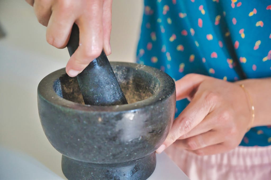 I use a mortar and pestle to crush the threads down a bit before adding them the dishes. Once the saffron hits the hot liquid, BAM. It doesn’t just add color to your dish! More importantly, it’ll add a sweet, floral flavor to your dishes.