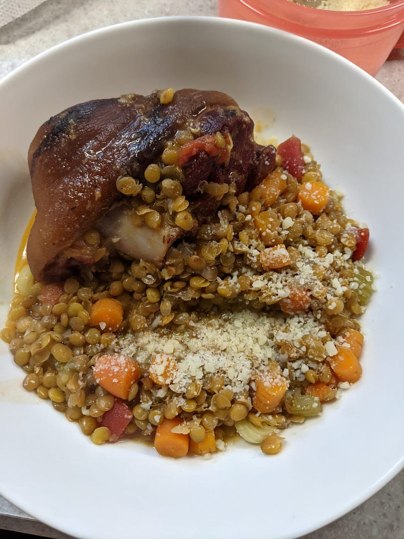 Lou reminded me that his grandmother Concetta would sometimes make this soup vegetarian and other times cook it with fresh pig skin. Yes – pig skin. He still laughs about how he and his siblings would fight over those tender pieces in the pot. When I made this soup for our own kids growing up, I didn’t use fresh pig skin, but I would occasionally add smoked ham hocks instead, letting them simmer at the beginning to flavor the broth before adding the lentils. As Lou says, it adds “such good porky goodness.” And he’s not wrong – the flavor is rich, savory, and deeply comforting.